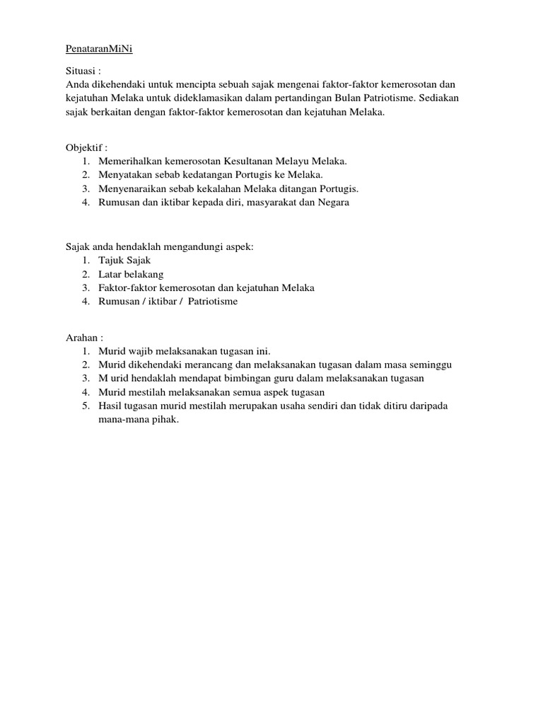 Video parameswara pengasas melaka 5.2.1 latar belakang parameswara parameswara merupakan seorang raja temasik yang berketurunan diraja empayar sampugita. Beliau berkhidmat di bawah empat sultan dan merupakan tulang belakang kepada perkembangan melaka ke mercu kekuasaannya di kepulauan melayu. Sebaik sampai di pintu masuk pengunjung boleh melihat beberapa bahan bacaan sebagai pengenalan tentang latar belakang istana kesultanan melaka ini. Rph pendidikan moral tahun 3 semakan 2019 rph pjpk tingkatan 4 2020 rph pendidikan seni visual tahun 5 2019 rph pk tahun 1 kssr semakan rph psv tahun 5 ts25 rph pendidikan kesihatan tahun 1 semakan 2017 rph psv tahun 5 2020 rph pendidikan moral tahun 4 2020 semakan. Kewujudan zaman paleolitik dikenal pasti telah berlaku lebih kurang 35 ribu tahun dahulu. Agama islam dijadikan sebagai agama rasmi kesultanan melayu melaka oleh sultan muzaffar syah. Kesultanan melayu melaka merupakan sebuah kesultanan melayu yang tertua dalam sejarah malaysia. Doc latar belakang sejarah melaka rikiko xiangling academia edu. Hal ini berubah pada tahun 14091 apabila parameswara berkahwin dengan puteri dari pasai. Kedudukan melaka yang strategik menyebabkan ia menjadi tumpuan pedagang dari kawasan asia tenggara dan barat. Kewujudan melaka yang merupakan lanjutan kerajaan sriwijaya, telah memperlihatkan percantuman sistem pemerintahan islam dengan tradisi kekerajaanan melayu di nusantara. Sejarah melaka bermula dengan pengasasan kesultanan melaka oleh parameswara, seorang bangsawan srivijaya dari palembang, pada tahun antara 1400 hingga 1403. Latar belakang alam melayu pada abad ke 15m.