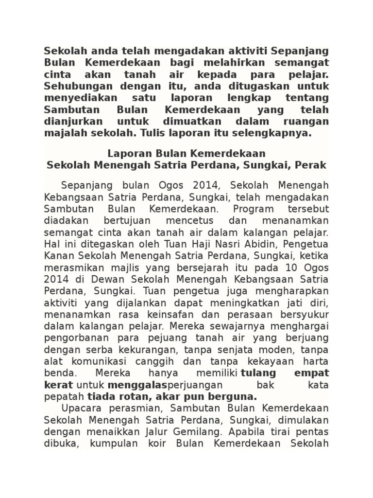 Karangan laporan spm format contoh aktiviti perkhemahan persatuan pengakap terbaik pelajar smakasas (peperiksaan. Subjek bahasa melayu (bm) adalah subjek yang amat penting untuk anda mahir sebab lulus atau gagal anda bergantung kepada keputusan subjek bm anda semasa spm. 0%0% found this document useful, mark this document as useful. Laporan tentang kesan pertumbuhan ipts di negara ini. Related posts to contoh format laporan kunjungan nasabah.